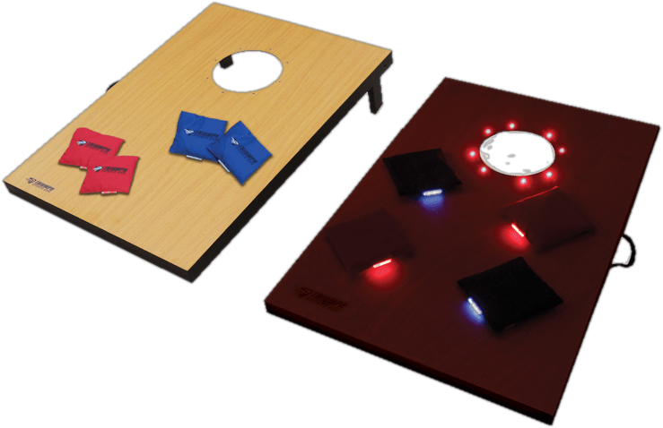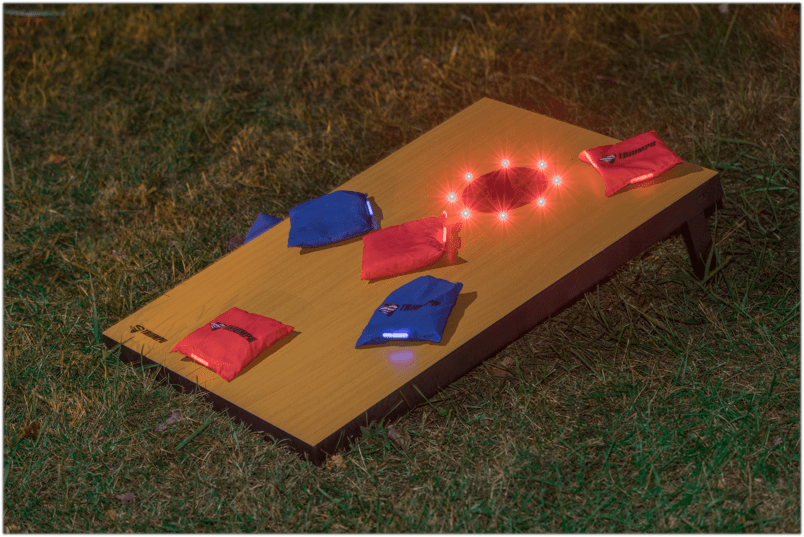 Play the traditional bag toss game in an innovative way with the 2' x 3' Tournament Manufactured wood Cornhole Board. The game platforms are lighted with small red lights, making them look stunning in your backyard. The bean bags include glow sticks, which add more brightness to the game.The Lighted Bag Toss Tournament Game Set from Nutty Party is perfect for nighttime play. Equipped with two 9-volt batteries are you are sure to have the time of your life with this game set.